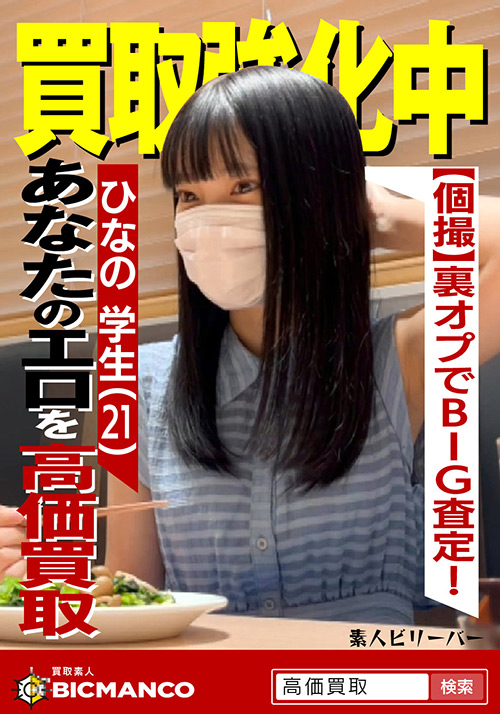 ヌードモデル撮影という名の高額バイトで「買取」された素人たち。ひなのさん・21歳・学生。か弱そうなニコニコ笑顔の学生さんのご応募です。ハードなプレイを求める彼氏がいるらしく少々ワケアリなご様子…。脱いだらマニアが興奮するカラダの持ち主の女子大生さんでした!そんなワケありアブノーマル素人美女のプライベートSEXを是非ご鑑賞ください…今宵あなたのエロを高価買取!